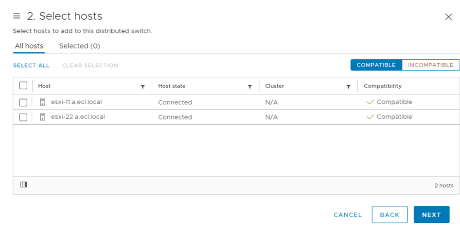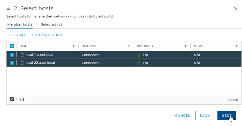 「2 Select hosts」にて、[esxi-11.a.ecl.local]および[esxi-22.a.ecl.local]にチェックを入れ、[NEXT]をクリックします。
