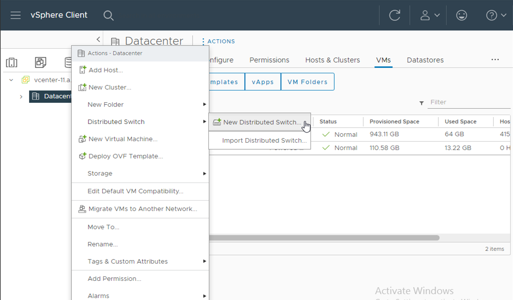 - vSphere Clientへログインし、左インベントリから、[vCenter]をクリックします。インベントリから、[vCenter]>[Inventory Trees]配下の[Networking]をクリックします。インベントリの[Datacenter]を右クリックし、[New Distributed Switch]をクリックします。