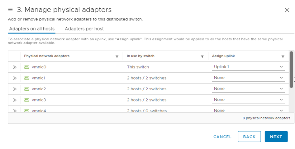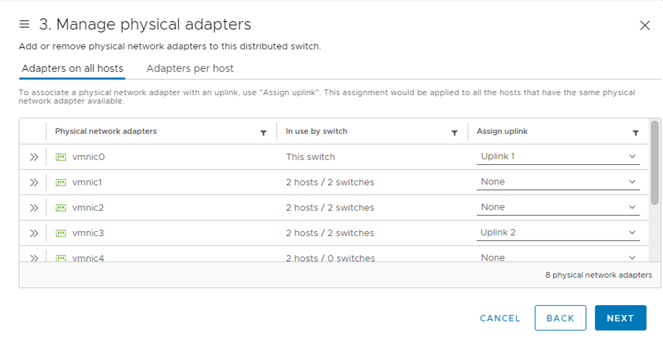「3 Manage physical adapters」にて、[vmnic3]を選択し、右の[Assign uplink]プルダウンから[uplink 2]を選択し、[NEXT]をクリックします。
