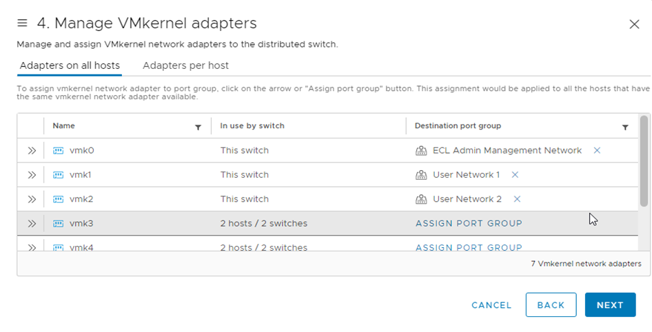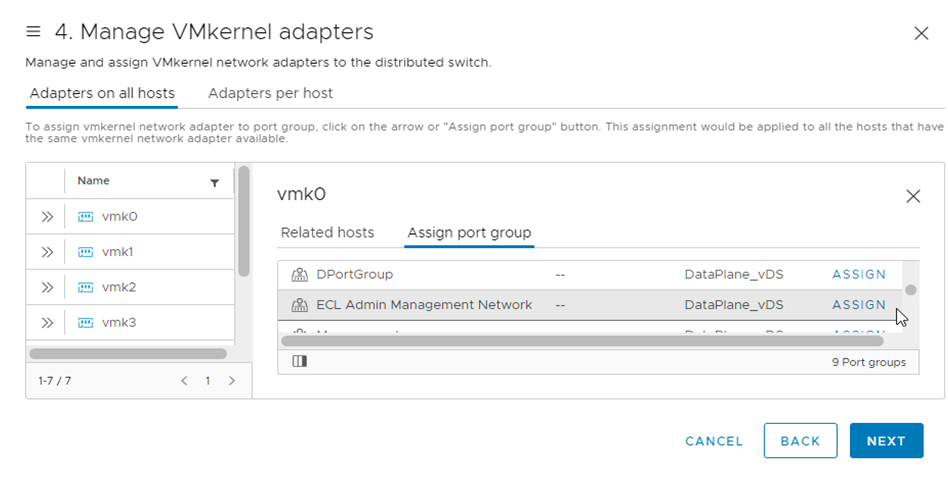 - 「4 Manage VMkernel adapters」にて移行対象のVMkernelポートを選択します。右ペインの[assign port group]から割り当て対象となるポートグループを選択し、右側の[ASSIGN]をクリックします。ポートグループが設定されたら、右ペインの一番内側の×をクリックします。