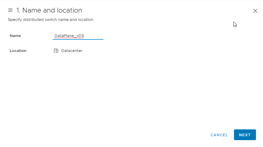 「New Distributed Switch」画面が表示されるので 「1 Name and location」にて、必要事項を入力し、[NEXT]をクリックします。