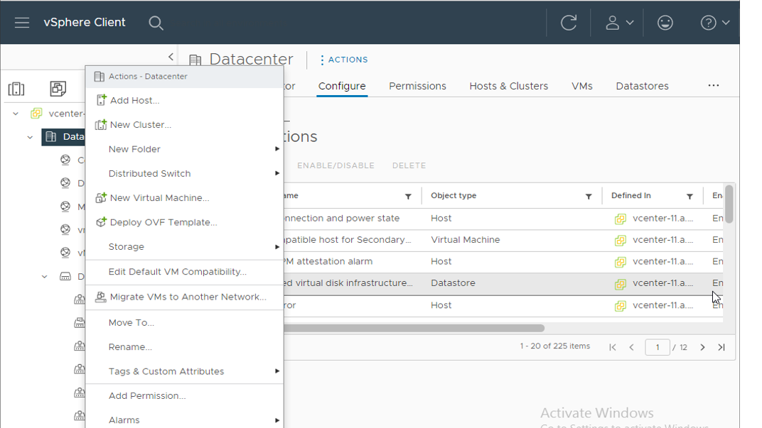 - vSphere Clientのインベントリから、[vCenter]>[Inventory Trees]配下の[Networking]をクリックします。[Datacenter]を右クリックし、[Migrate VMs to Another Network...]をクリックします。