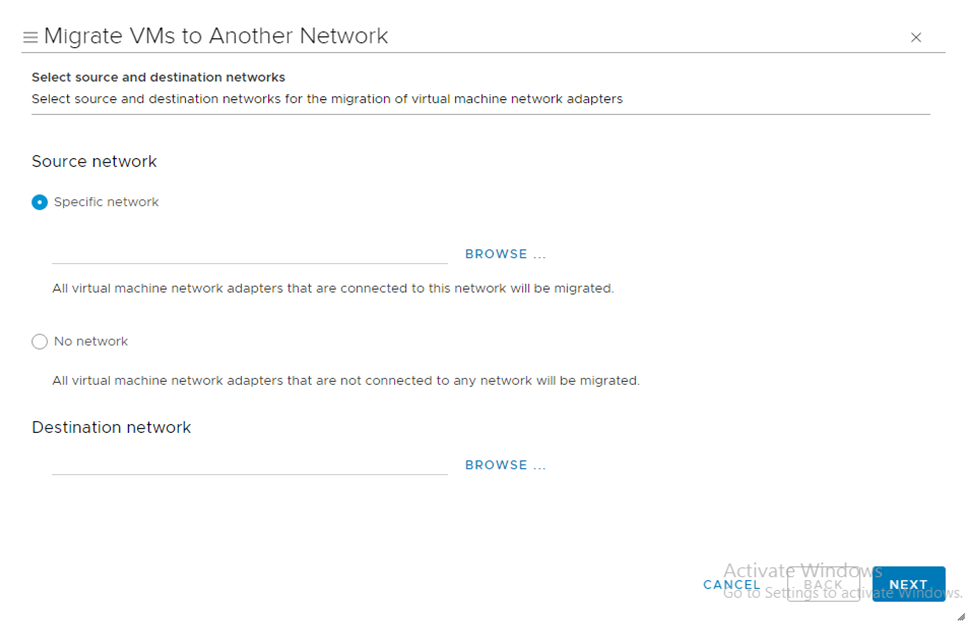 「Migrate VMs to Another Network」画面が表示されるので、「Select source and destination networks」にて必要事項を入力し、[NEXT]をクリックします。