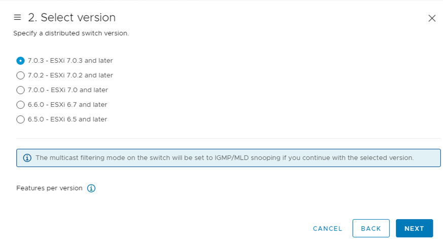 「2 Select version」にて、[Distributed switch: 7.0.3]を選択し、[NEXT]をクリックします。