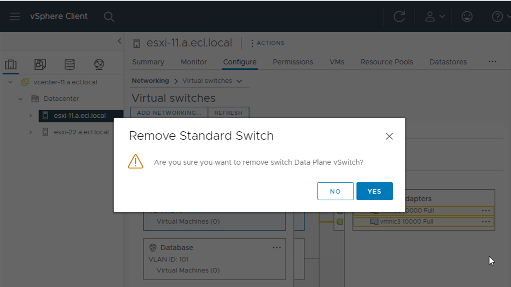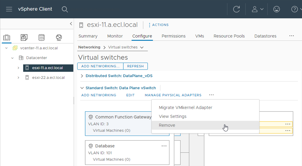 - vSphere Clientのインベントリから、[Datacenter]配下の[esxi-11.a.ecl.local]を選択し、右側ペインから[Configure]タブをクリックします。[Configure]タブ内の[Networking]>[Virtual switches]をクリックします。削除対象の仮想マシンスイッチを選択し、[Remove]をクリックします。