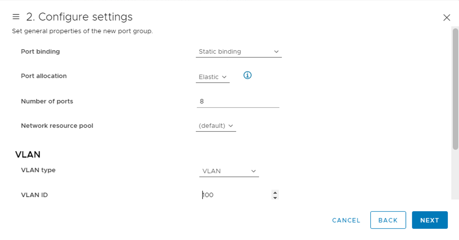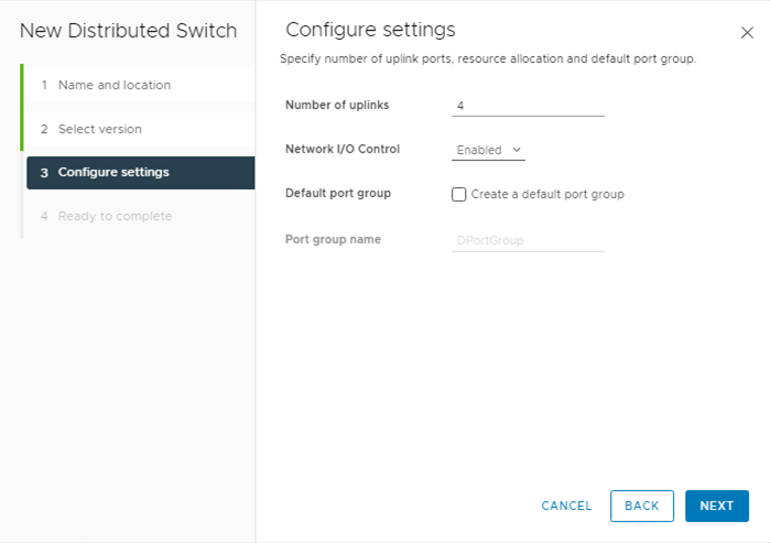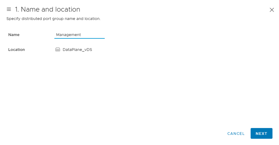 「New Distributed Port Group」画面が表示されるので、「1 Name and location」にて必要項目を入力し、[NEXT]をクリックします。