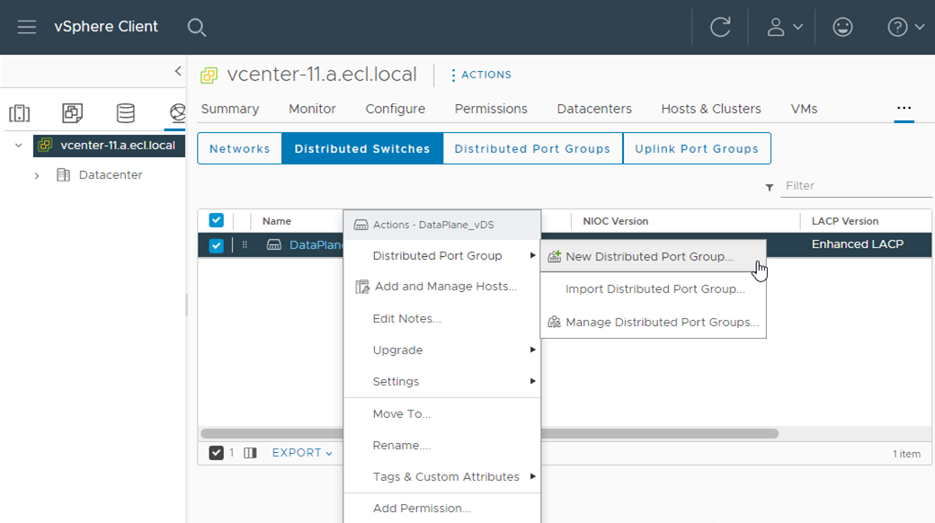- vSphere Clientのインベントリから、[vCenter]>[Inventory Trees]配下の[Networking]をクリックします。作成したvDSを右クリックし、[New Distributed Port Group]をクリックします。