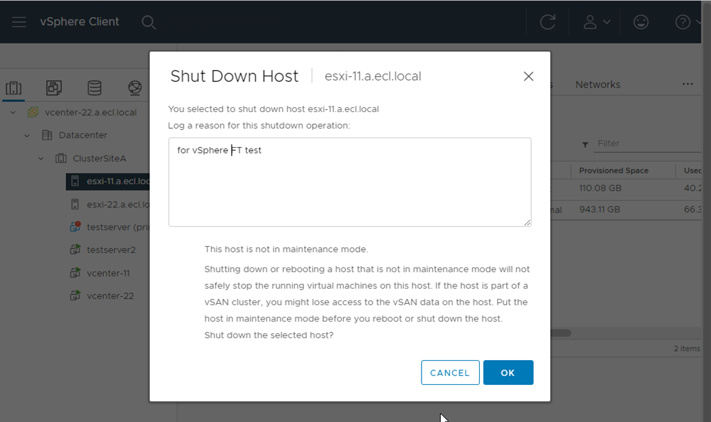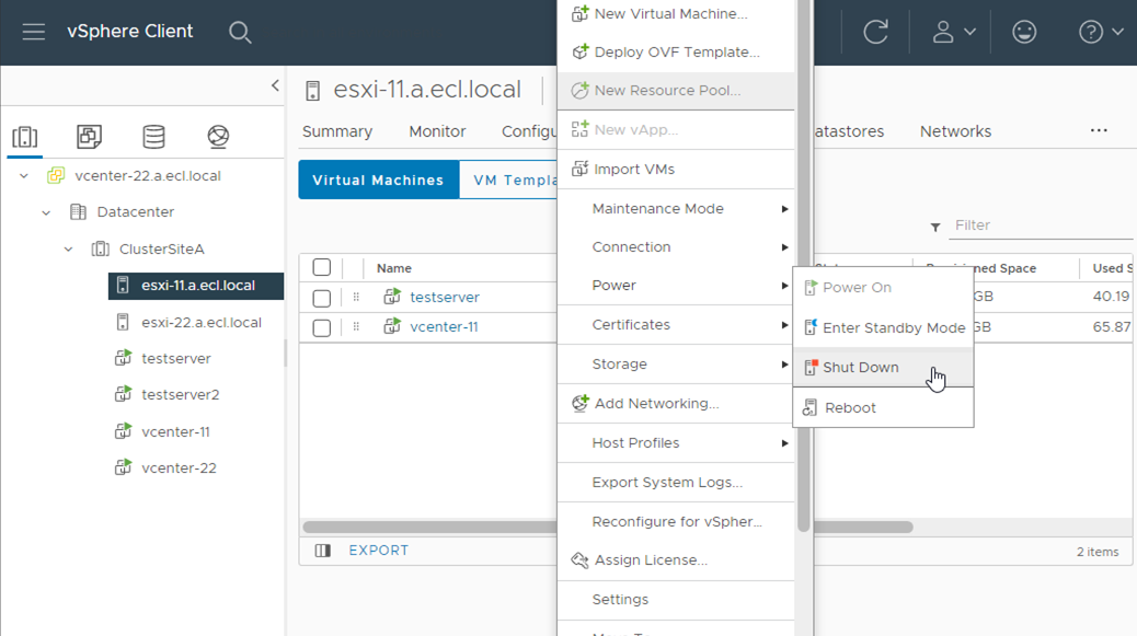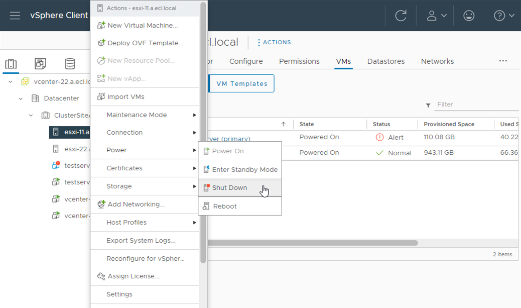 ブラウザーからvSphere Clientに接続し、試験対象の仮想マシンが導入されているESXiを選択し、[Actions]>[Shut Down]をクリックします。