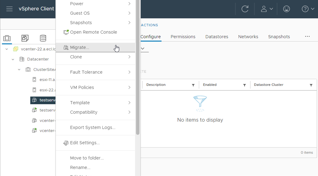 Web Clientから左ペインの対象仮想マシンを選択し、右ペインの[Actions]>[Migrate...]をクリックします。