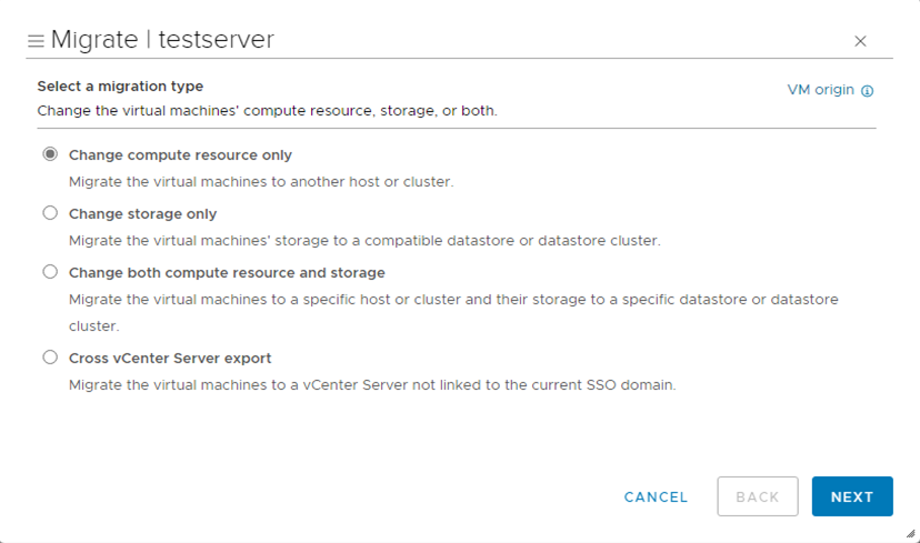 「Migrate」画面にて[Change compute resource only]を選択し、[NEXT]をクリックします。