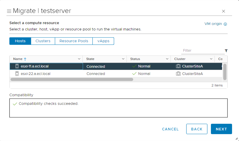 移行先のESXiを選択し、[NEXT]をクリックします。
