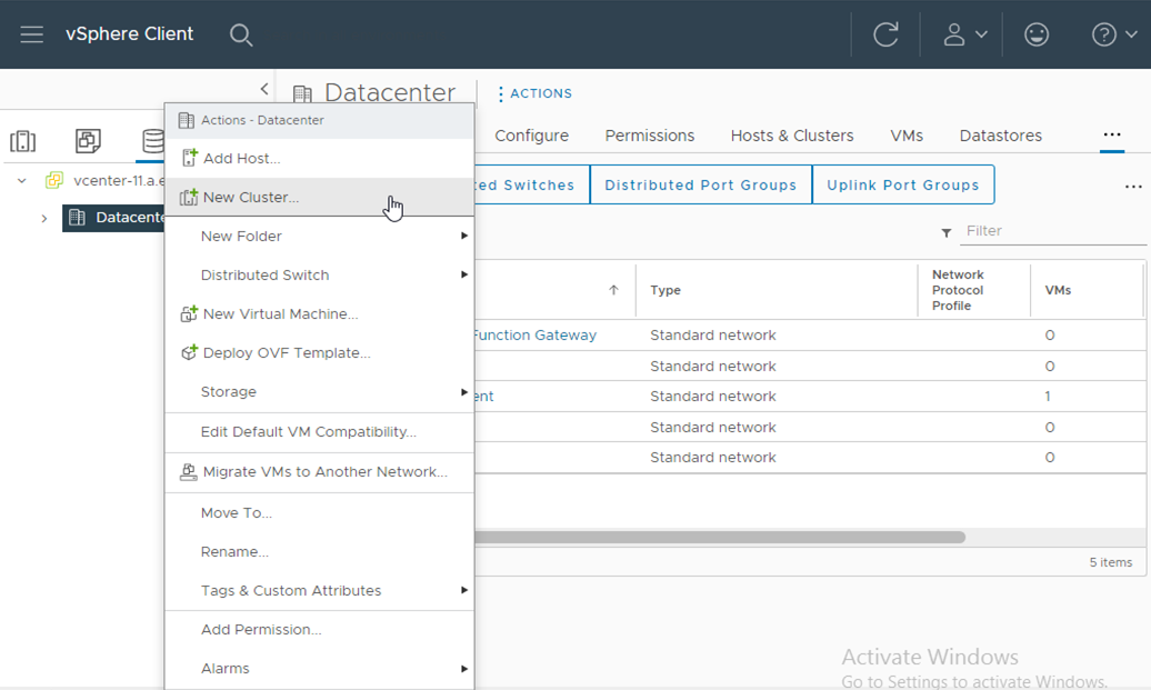 vSphere Clientへログインし、インベントリの[Datacenter]を右クリックし、[New Cluster]をクリックします。