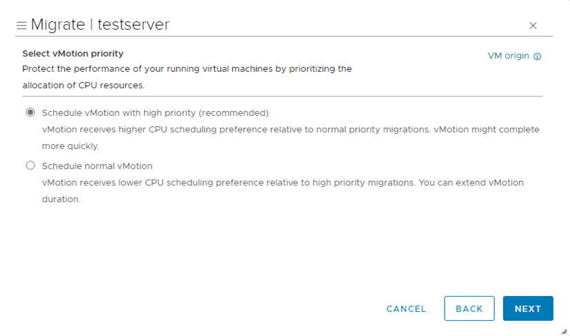 「Select vMotion priority」にて[Schedule vMotion with high priority (recommended)]を選択し[NEXT]をクリックします。