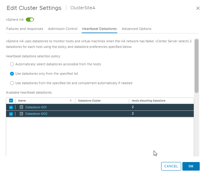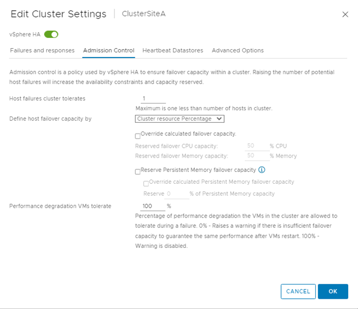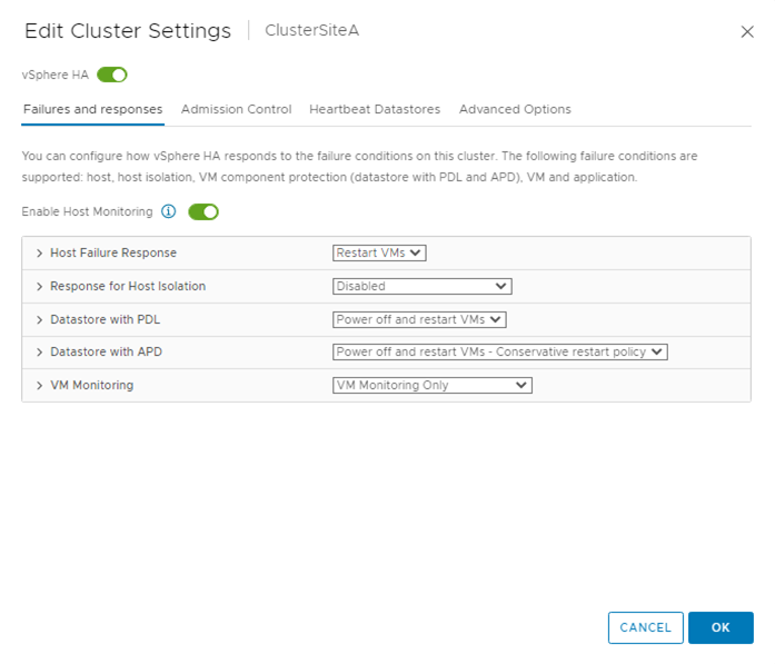 「Edit Cluster Settings」画面が表示されるので、[Failures and responses]タブで設定を選択して[OK]をクリックします。