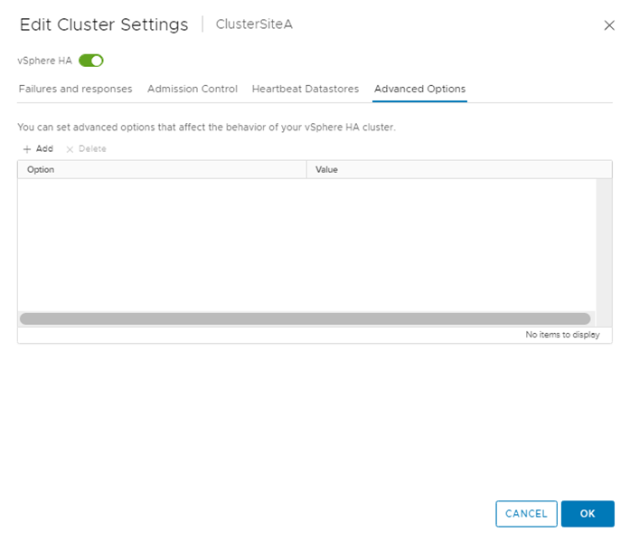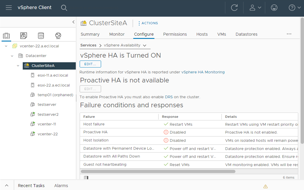 - vSphere Clientへログインし、インベントリから[Datacenter]>[Clusters]>[ClusterSiteA]を選択します。[Configure]>[Services]>[vSphere Availability]を選択し、[vSphere HA is Turned ON]と表示されている下の[EDIT...]ボタンをクリックします。