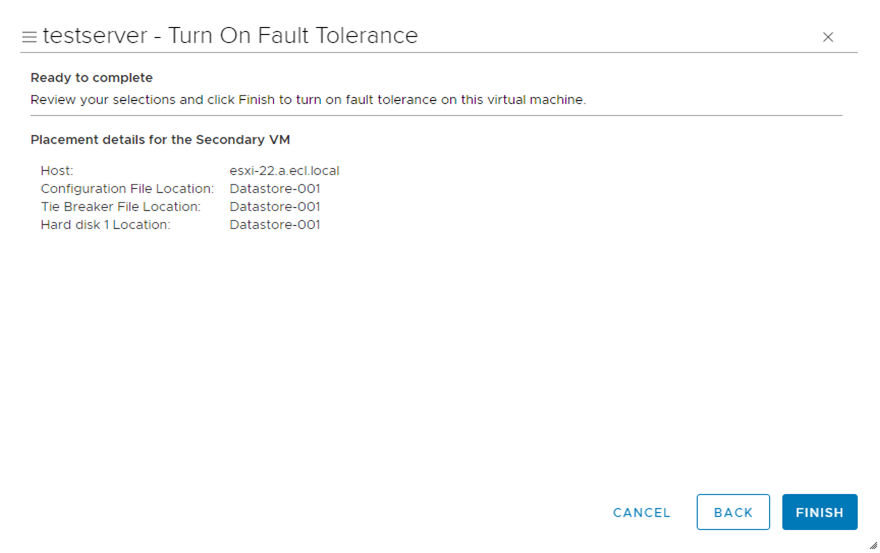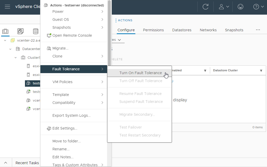 試験用仮想マシンを右クリックし、[Actions]>[Fault Tolerance]>[Turn on Fault Tolerance]をクリックします。
