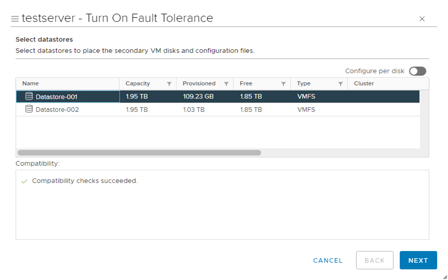 「Select datastores」画面が表示されるので、Secondaryを作成するストレージを選択します。