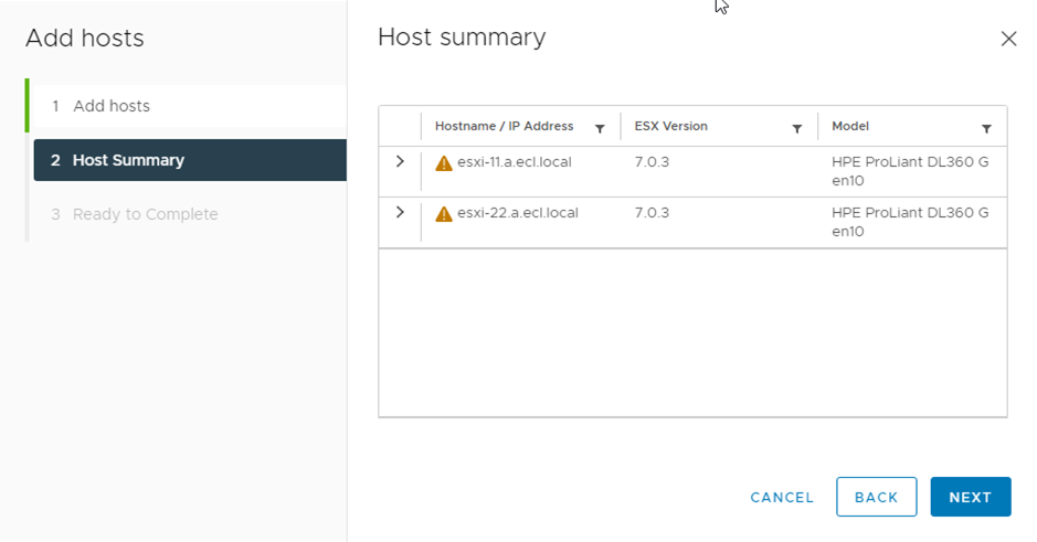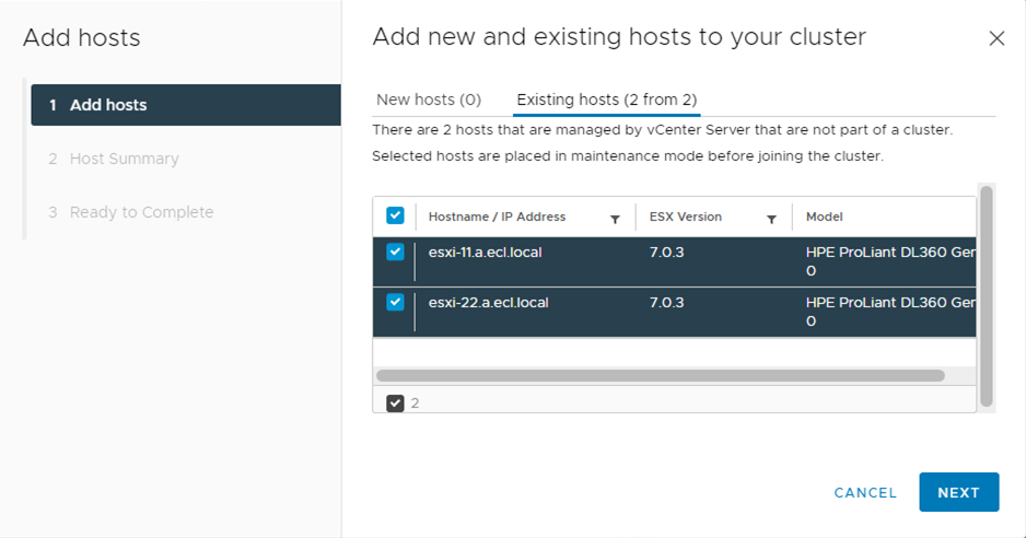 「Add new and existing hosts to your cluster」画面が表示されるので、[Existing hosts]タブ内のすべてのESXiホストにチェックを入れ、[NEXT]をクリックします。
