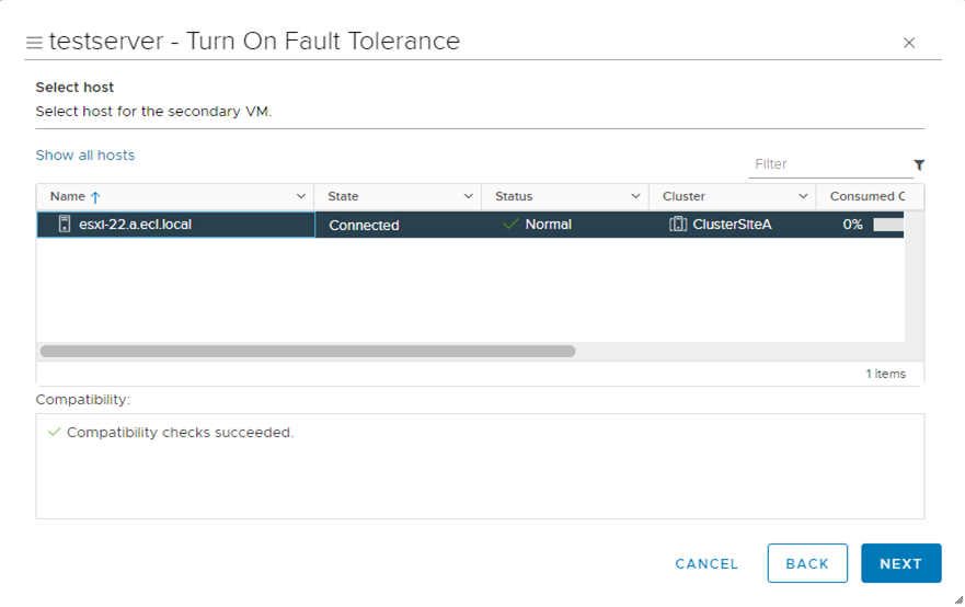 「Select host」画面が表示されるので、Secondaryを置く対象ホストを選択します。