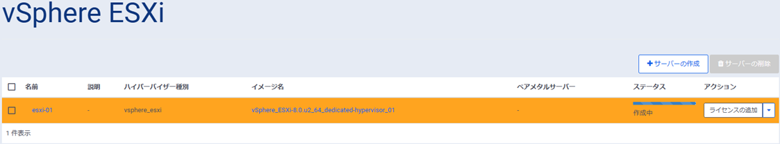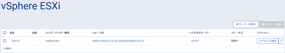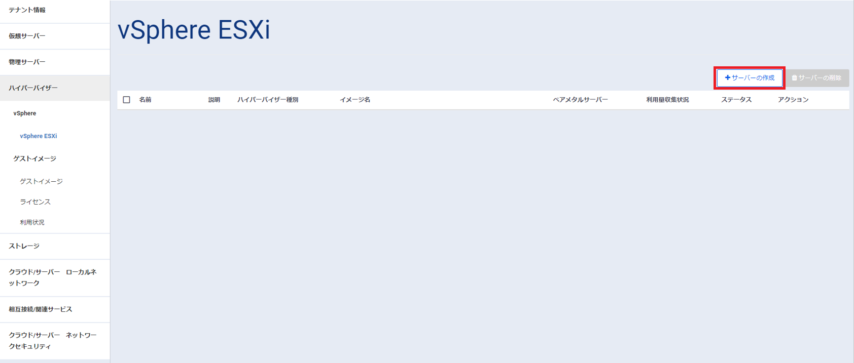 - 画面左のナビゲーションより、[ハイパーバイザー]>[vSphere]>[vSphere ESXi]をクリックします。「vSphere ESXi」画面右上の[+サーバー作成]をクリックします。