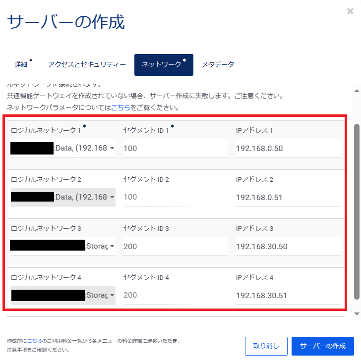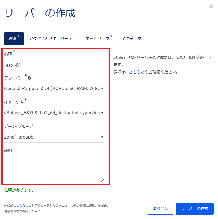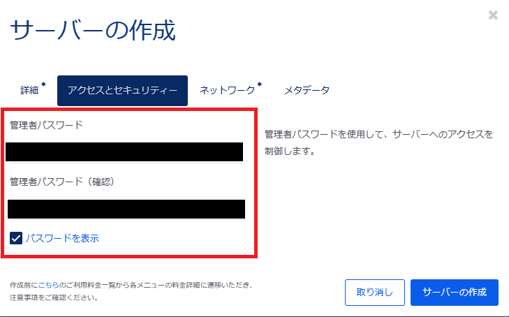 「サーバー作成」画面[アクセスとセキュリティー]設定例¶ 項目
