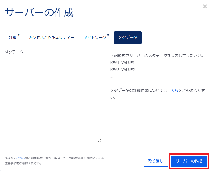 [メタデータ]に必要事項を入力し、[サーバーの作成]をクリックします。