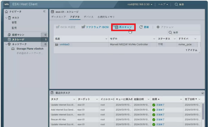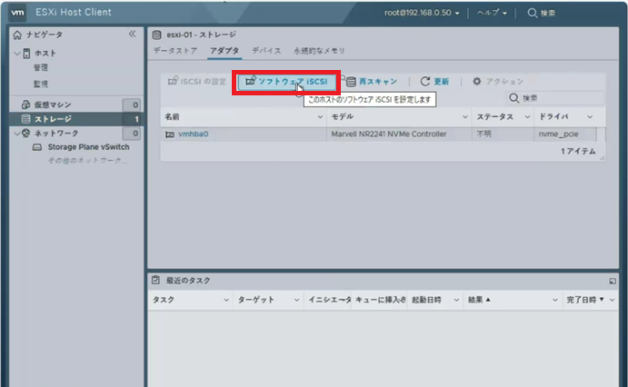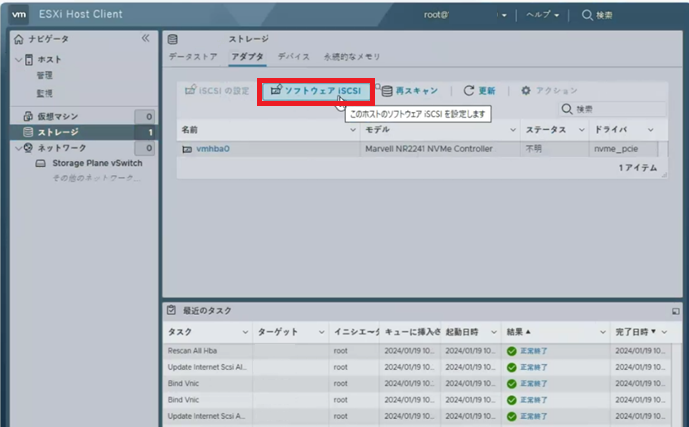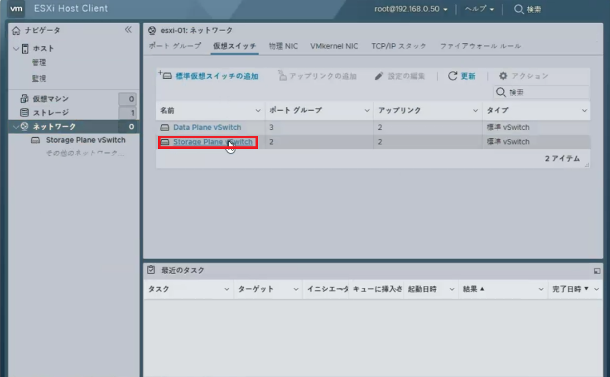 VMware Host Clientにて左側[ナビゲータ]ペインから[ネットワーク]の[仮想スイッチ]タブの[Storage Plane vSwitch]をクリックします。