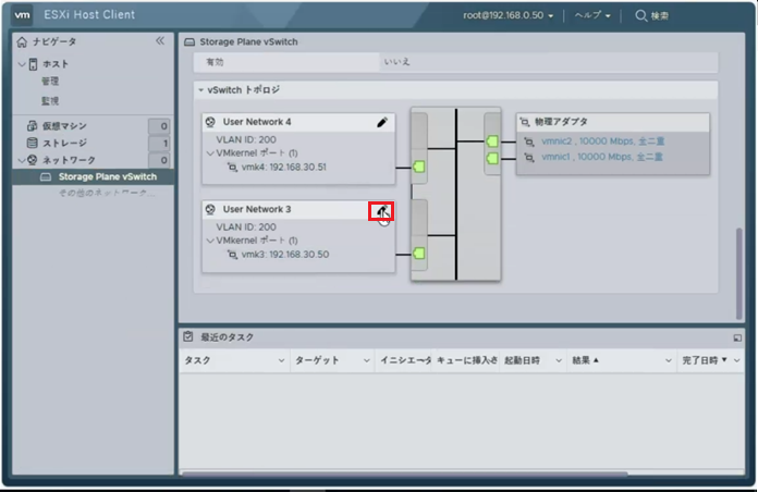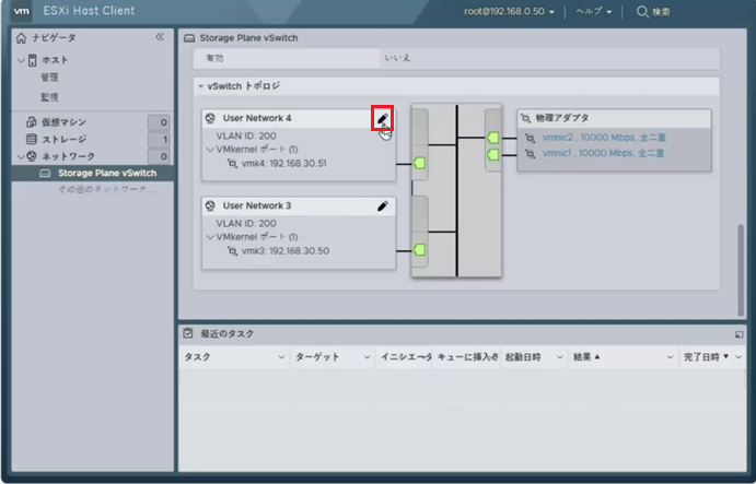 [vSwitch トポロジ]で、老番のポートグループ(この例では[User Network 4])の右側にある編集ボタン(鉛筆のアイコン)をクリックします。