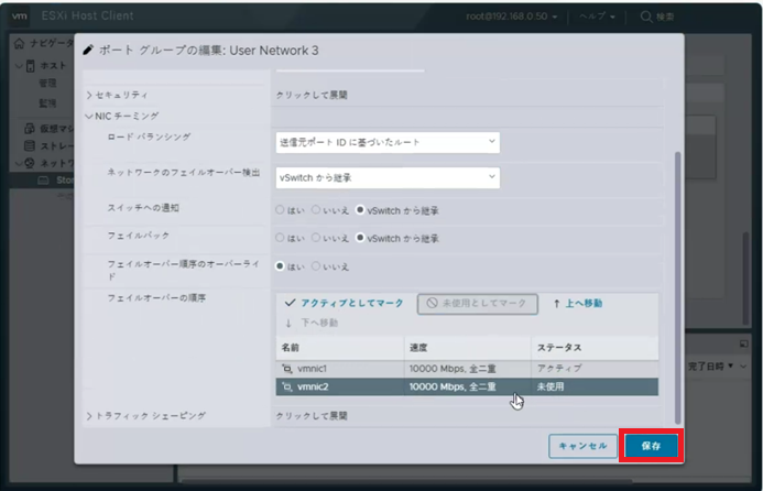 [NIC チーミング]セクションを展開し、[フェイルオーバーの順序]で老番のネットワークアダプターをクリックし、[未使用としてマーク]をクリックし、[ステータス]が[未使用]に変わることを確認し、保存ボタンをクリックします。