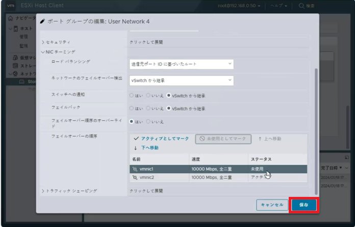 [NIC チーミング]セクションを展開し、[フェイルオーバーの順序]で若番のネットワークアダプターをクリックし、[未使用としてマーク]をクリックし、[ステータス]が[未使用]に変わることを確認し、保存ボタンをクリックします。