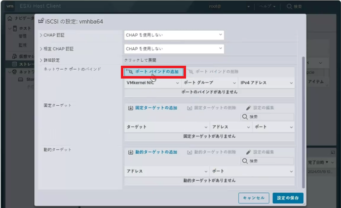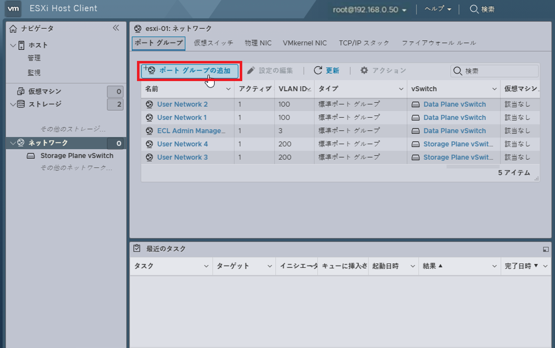 - 前項で作成した仮想マシン通信用のロジカルネットワークのポートに接続するための仮想マシンポートグループを作成します。VMware Host Clientにて左ペインの[ネットワーク]をクリックし、[ポートグループの追加]をクリックします。