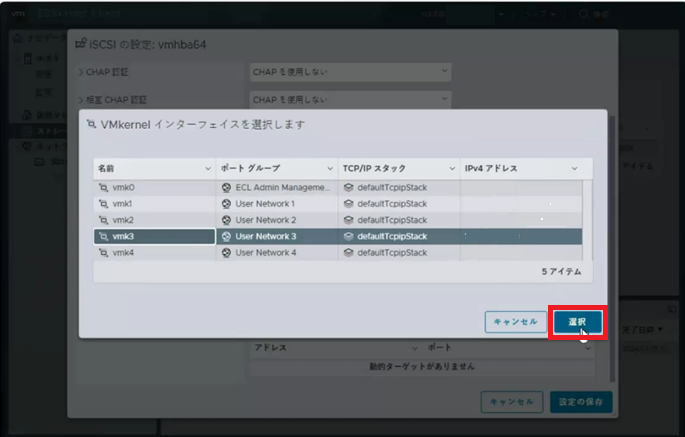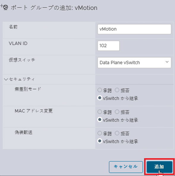 vMotionのポートグループを追加します。ウィザードに従って入力または選択し、[追加]をクリックします。