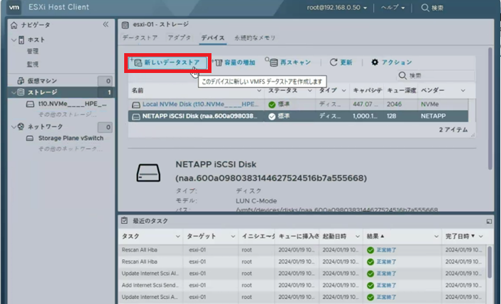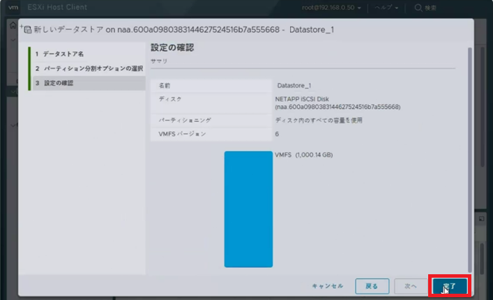 ファイルストレージスタンダードを利用したDatastoreのマウント方法は vSphere ESXi6.0 ファイルストレージスタンダードのマウント方法について をご参照ください。