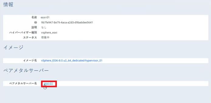 [ベアメタルサーバー]に指定したサーバー名が表示され、[ステータス]が[作成中]から[稼働中]に変化した事を確認します。