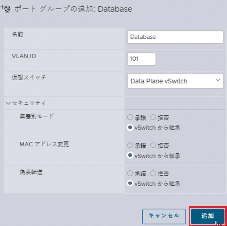 Databaseのポートグループを追加します。ウィザードに従って入力または選択し、[追加]をクリックします。