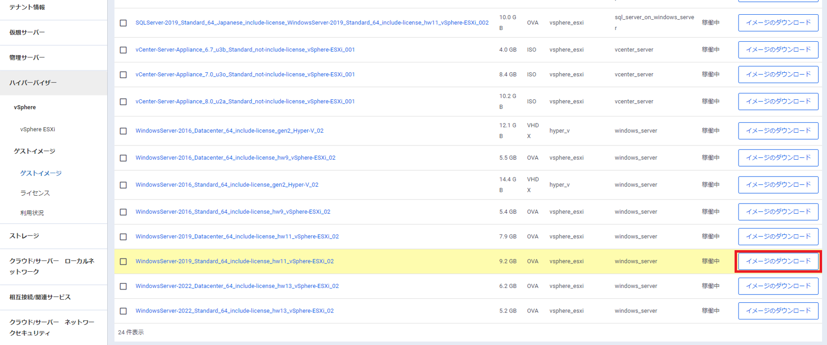 - Webブラウザーにて、SDPFポータルの[Cloud Computing Control Panel]左ペインの[ハイパーバイザー]>[ゲストイメージ]>[ゲストイメージ]を開き、以下のイメージ名の右の[イメージをダウンロード]をクリックします。- WindowsServer-2019_Standard_64_include-license_hw11_vSphere-ESXi_02