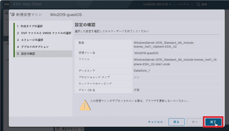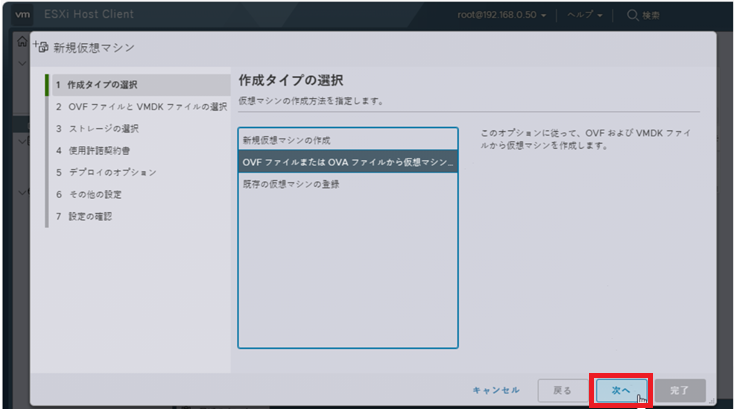前項で取得したOVAテンプレートを使用し、ハイパーバイザー(vSphere ESXi)上に仮想マシンを作成します。