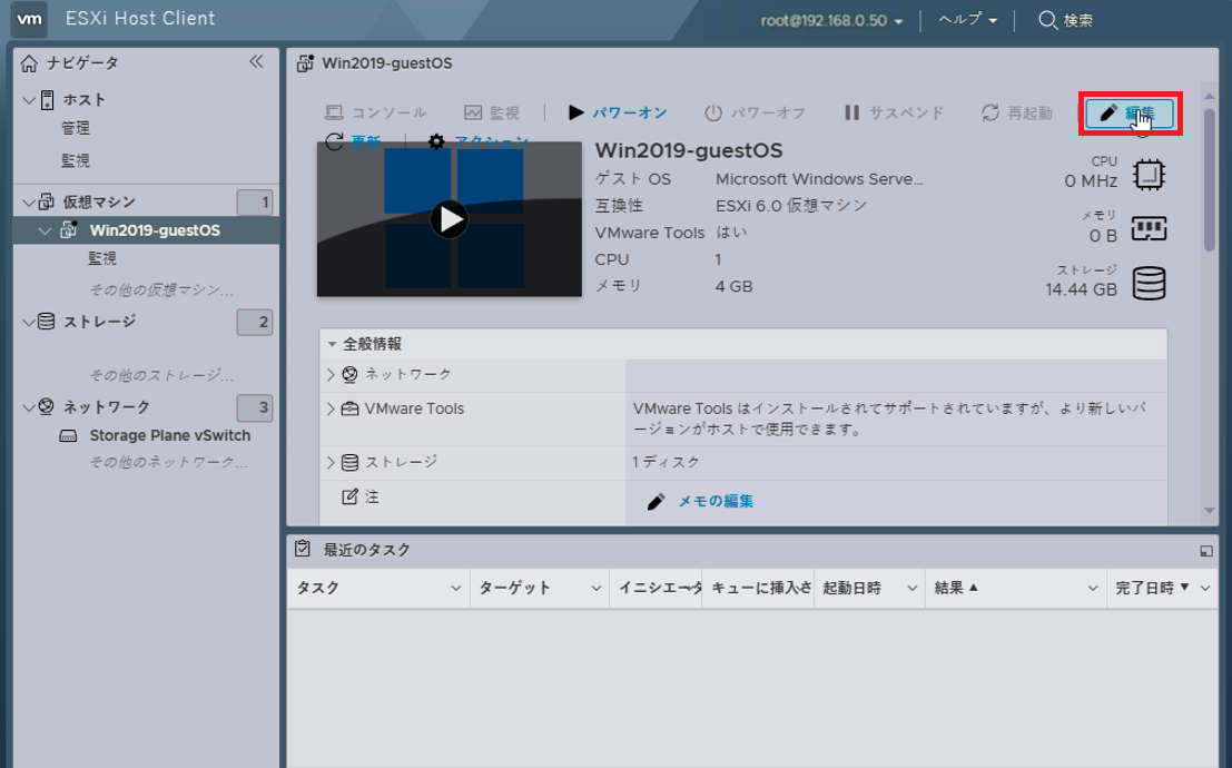 VMware Host Clientにて左ペインで[仮想マシン]をクリックし、右ペインで対象仮想マシンをクリックし、[編集]をクリックします。