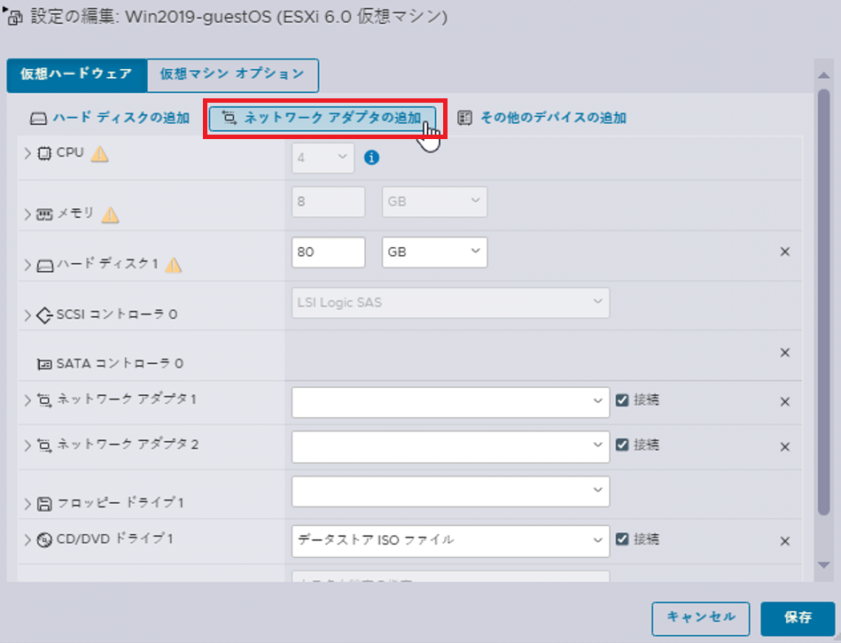 [ハードウェア]>[メモリ]/[CPU]は値の変更、[ハードウェア]>[ネットワークアダプタ1]~[ネットワークアダプタ3]は新規追加。