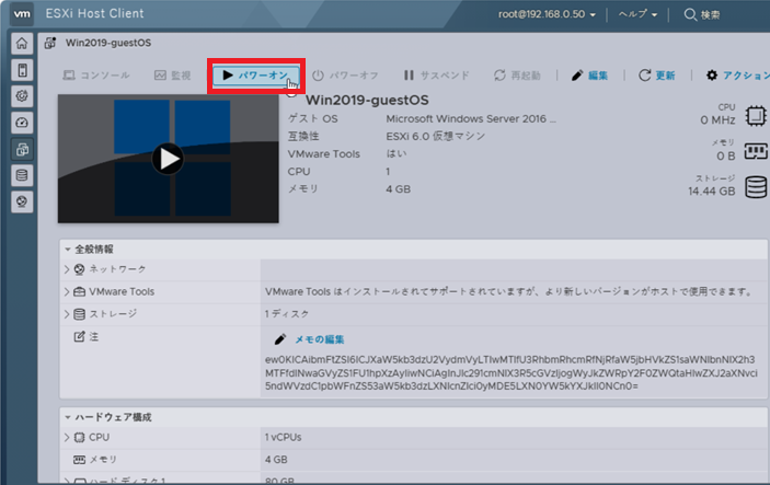 VMware Host Clientにて仮想マシンの上の[パワーオン]をクリックします。