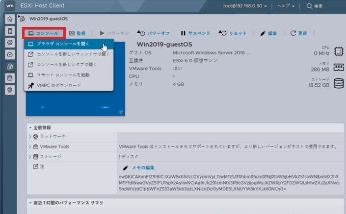 構築されたvSphere ESXiが正常に機能することを確認し、また後の章でvCenter Serverのインストーラー起動やvSphere HAの検証に用いる仮想マシンイメージ(OVAテンプレート)を取得します。
