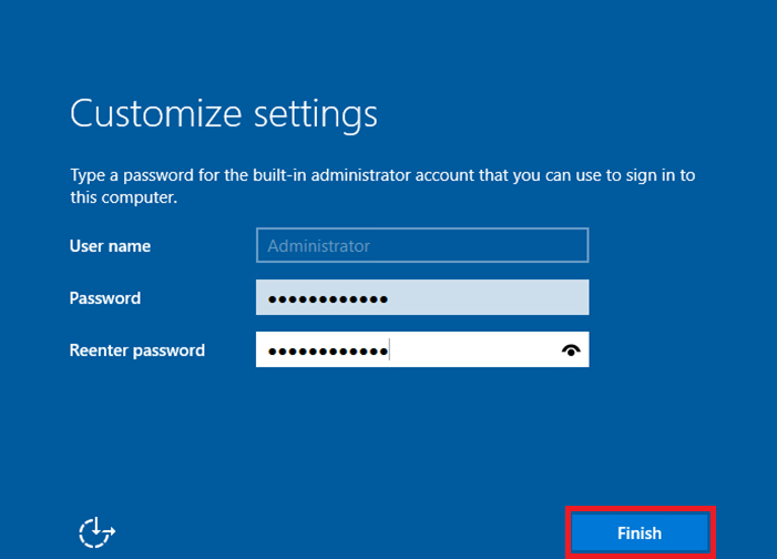 「Customize settings」の表示後、設定するAdministratorのパスワードおよび確認用パスワードを入力し、[Finish]をクリックします。
