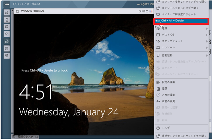 仮想マシンコンソールに「Welcome」画面が表示された後に、仮想マシンコンソールの[VM]>[Guest]>[Send Ctrl+Alt+del]をクリックします。