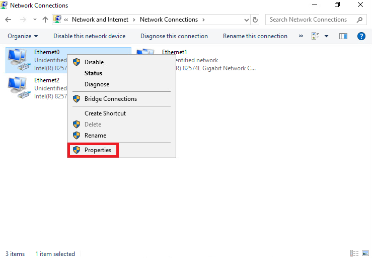 「Network Connections」を開き、イーサネットアダプターそれぞれにIPアドレスなどの設定をします。