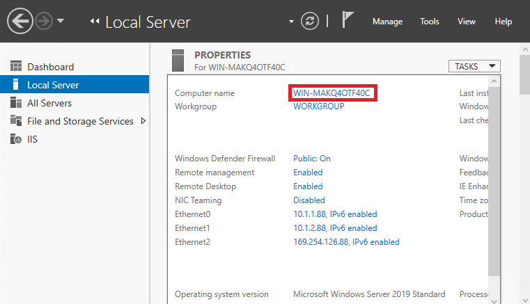 「Remote Desktop Connection」にて仮想マシンに接続し、[Server Manager]>[Local Server]を開いて、[Computer name]右のコンピューター名のリンクをクリックします。