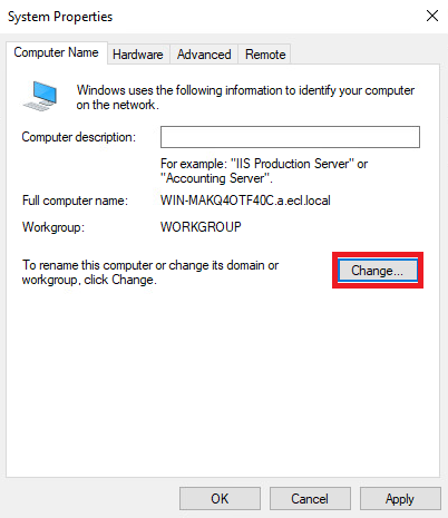 「System Properties」にて、[Computer Name]の[Change...]をクリックします。