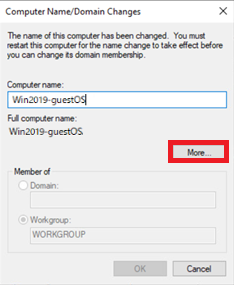 「Computer Name/Domain Changes」ダイアログの[Computer name:]下のテキストボックスにコンピューター名を入力し、[More...]をクリックします。