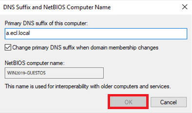 「DNS Suffix and NetBIOS Computer Name」ダイアログの[Primary DNS Suffix of the computer:]にDNSドメイン名を入力し、[OK]をクリックします。