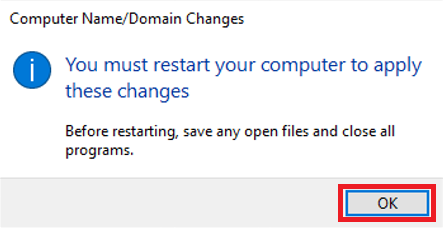 「Computer name/Domain Changes」で変更後、再起動の確認があるので[OK]をクリックします。