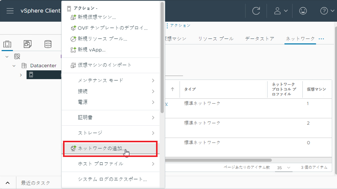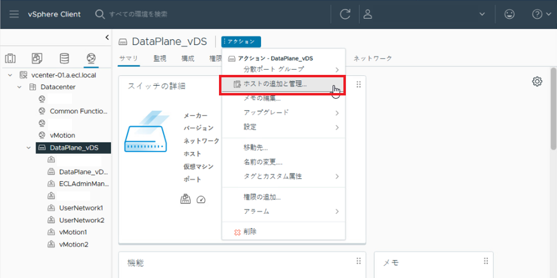 - vSphere Clientのインベントリから、[vCenter]>[インベントリ ツリー]配下の[ネットワーク]をクリックします。作成したvDSを選択し、[アクション]>[ホストの追加と管理]をクリックします。